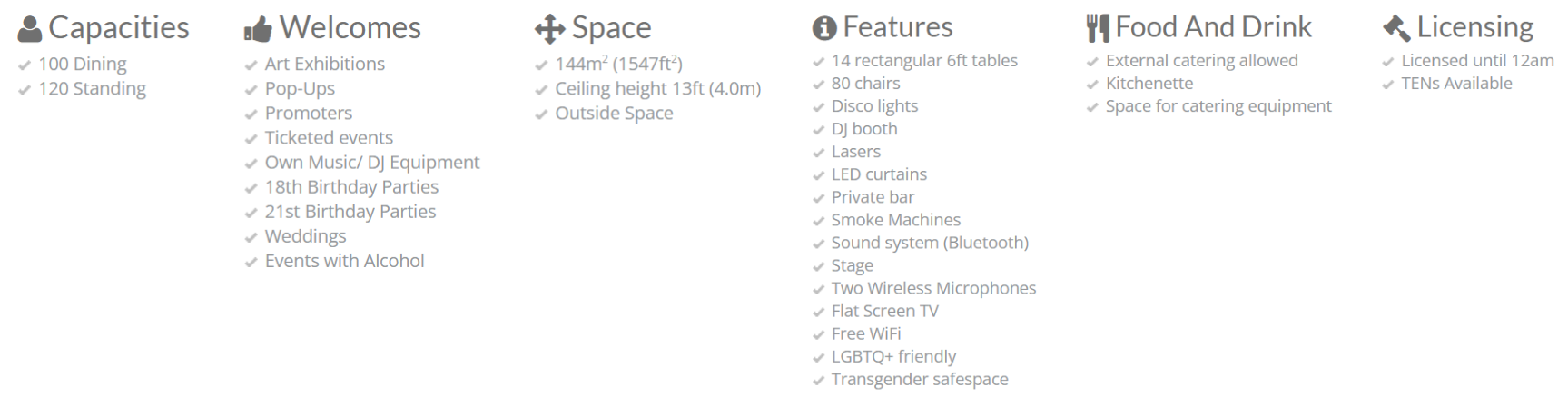 The hall can accommodate up to 120 guests, ensuring ample space for parties, workshops, rehearsal spaces, audition spaces, and productions. Facilities include a kitchen with essential appliances, a private bar, a sound system, disco lights, a DJ booth & free WiFi. With fourteen 6ft foldable tables and eighty chairs available, the hall is well-equipped for various setups. We use Alto audio systems with: -